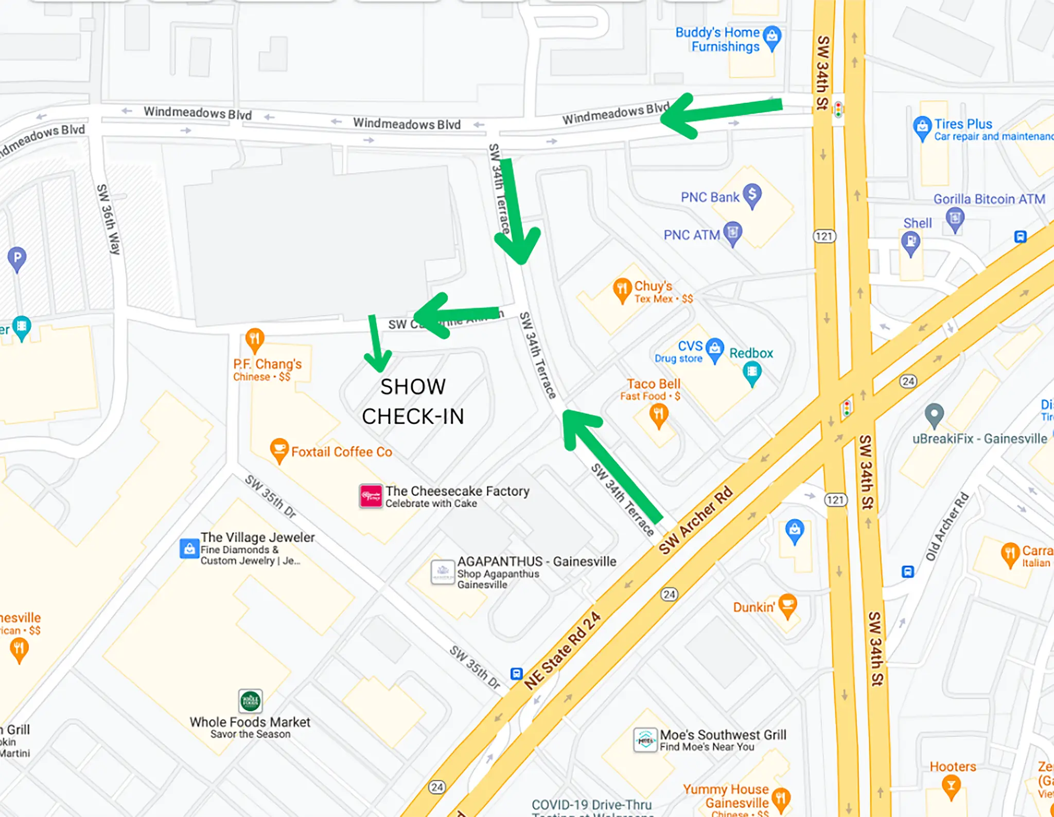 From Archer Road, please enter at SW 35th Drive (in front of Blue Gill) and follow signage and volunteers directing traffic.