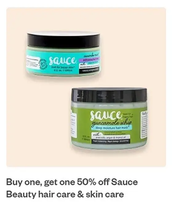 Stop by and buy one, get one 50% off Sauce Beauty hair care & skin care in store.